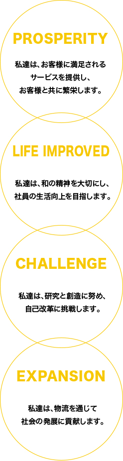 「安全輸送」、それは運送会社を営む私達にとって当たり前のことです。 そのために必要となる車輌や倉庫をはじめとする設備やシステムへの投資は もちろんのこと、それらを使うスタッフの教育を重要視しています。 企業は、「人、物、金」で成り立っていると言われておりますが、 3つの要素の一番最初に表現されている「人」がいきいきと お客様、社会、自身、そして社会の為に働くことが、古くから商売人の基本とされる> 「三方善し」の現代の在り方である「四方善し」につながるのではないかと考えております。 安かろう悪かろうではなく、安心と安全、さらなる付加価値を提供させていただくことを 心がけてまいります。